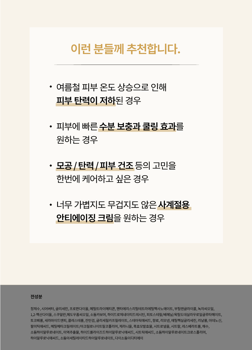 가볍지만 놀랍도록 풍부한 텍스처가 피부에 부드럽게 녹아들어 강력한 보습 에너지를 채워주는 토탈 안티에이징 크림
